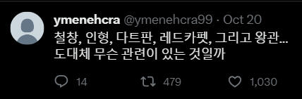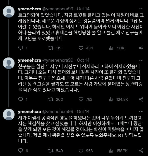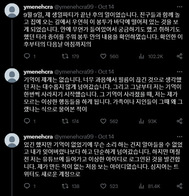 Korean:얼마 전부터 저는 이상한 일들을 겪고 있습니다. 이 이상한 종이를 주운 후부터 모든 일이 시작되었습니다. 이 종이에 대해 알고계시거나 저와 같은 일을 겪으신 분들은 저에게 DM부탁드립니다.9월 9일, 제 생일파티가 끝난 후의 일이었습니다. 친구들과 함께 놀고 집에 오는 길에서 우연히 이 봉투가 바닥에 떨어져 있는 것을 보게 되었습니다. 안에 무언가 들어있어서 궁금하기도 했고 취하기도 했던 터라 종이를 주워 봉투 안의 내용을 확인하였습니다. 확인한 이후부터의 다음날 아침까지의기억이 제게는 없습니다. 너무 과음해서 필름이 끊긴 것으로 생각했던 저는 대수롭지 않게 넘어갔습니다. 그리고 그날부터 저는 기억이 한번씩 사라지기 시작했습니다. 그 기억이 사라졌을 때, 저는 제가 모르는 이상한 행동들을 하게 됩니다. 가족이나 지인들이 그때 왜 그랬냐는 식으로 물어본 적이있긴 했지만 기억이 없었기에 무슨 소리 하는 건지 알아들을 수 없었고 내가 잊어버렸나보다 하고 단순하게 넘어갔습니다. 하지만 며칠 전 저는 유튜브에 들어가고 이상한 아이디로 로그인된 것을 발견합니다. 제가 만든 적이 없는 처음 보는 아이디였습니다. 심지어는 트위터도 새로운 계정으로로그인되어 있었습니다. 지금 트윗을 올리고 있는 이 계정이 바로 그 계정입니다. 새로운 계정이 생기는 것들쯤이야 별거 아니니 그냥 넘어갈 수 있습니다. 하지만 어제 트위터에 들어와 보니 이상한 사진이 하나 올라와 있었고 휴대폰을 해킹당한 줄 알고 놀란 채로 친구들에게 고민을 토로했습니다.친구들은 일단 무서우니 사진부터 삭제하라고 하여 삭제하였습니다. 그러나 오늘 다시 들어와 보니 같은 사진이 또 올라와 있었습니다. 아무튼 친구들은 요새 들어 제가 다른 사람 같았다며 친구가 그리던 왕관 그림을 찢기도 또 모르는 사람 가방에 붙어있는 왕관키링을 떼간 적도 있다고 하였습니다.제가 이렇게 공격적인 행동을 하였다는 것이 너무 무섭게 느껴졌고 저는 해결책을 찾고 싶었습니다. 하지만 이상하게도 그때부터 왕관을 찾게 되면 모든 것이 해결될 것이라는 확신이 머릿속을 떠나지 않습니다. 제발 제가 왕관을 찾을 수 있도록 도와주세요. RT 부탁드립니다.