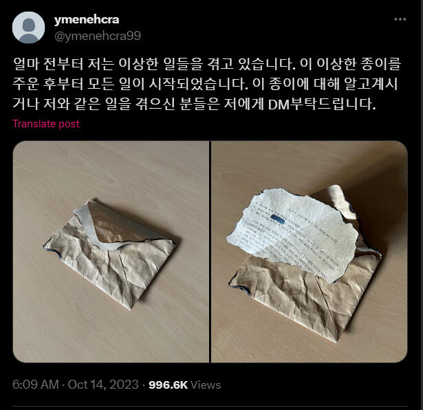 Korean:얼마 전부터 저는 이상한 일들을 겪고 있습니다. 이 이상한 종이를 주운 후부터 모든 일이 시작되었습니다. 이 종이에 대해 알고계시거나 저와 같은 일을 겪으신 분들은 저에게 DM부탁드립니다.9월 9일, 제 생일파티가 끝난 후의 일이었습니다. 친구들과 함께 놀고 집에 오는 길에서 우연히 이 봉투가 바닥에 떨어져 있는 것을 보게 되었습니다. 안에 무언가 들어있어서 궁금하기도 했고 취하기도 했던 터라 종이를 주워 봉투 안의 내용을 확인하였습니다. 확인한 이후부터의 다음날 아침까지의기억이 제게는 없습니다. 너무 과음해서 필름이 끊긴 것으로 생각했던 저는 대수롭지 않게 넘어갔습니다. 그리고 그날부터 저는 기억이 한번씩 사라지기 시작했습니다. 그 기억이 사라졌을 때, 저는 제가 모르는 이상한 행동들을 하게 됩니다. 가족이나 지인들이 그때 왜 그랬냐는 식으로 물어본 적이있긴 했지만 기억이 없었기에 무슨 소리 하는 건지 알아들을 수 없었고 내가 잊어버렸나보다 하고 단순하게 넘어갔습니다. 하지만 며칠 전 저는 유튜브에 들어가고 이상한 아이디로 로그인된 것을 발견합니다. 제가 만든 적이 없는 처음 보는 아이디였습니다. 심지어는 트위터도 새로운 계정으로로그인되어 있었습니다. 지금 트윗을 올리고 있는 이 계정이 바로 그 계정입니다. 새로운 계정이 생기는 것들쯤이야 별거 아니니 그냥 넘어갈 수 있습니다. 하지만 어제 트위터에 들어와 보니 이상한 사진이 하나 올라와 있었고 휴대폰을 해킹당한 줄 알고 놀란 채로 친구들에게 고민을 토로했습니다.친구들은 일단 무서우니 사진부터 삭제하라고 하여 삭제하였습니다. 그러나 오늘 다시 들어와 보니 같은 사진이 또 올라와 있었습니다. 아무튼 친구들은 요새 들어 제가 다른 사람 같았다며 친구가 그리던 왕관 그림을 찢기도 또 모르는 사람 가방에 붙어있는 왕관키링을 떼간 적도 있다고 하였습니다.제가 이렇게 공격적인 행동을 하였다는 것이 너무 무섭게 느껴졌고 저는 해결책을 찾고 싶었습니다. 하지만 이상하게도 그때부터 왕관을 찾게 되면 모든 것이 해결될 것이라는 확신이 머릿속을 떠나지 않습니다. 제발 제가 왕관을 찾을 수 있도록 도와주세요. RT 부탁드립니다.